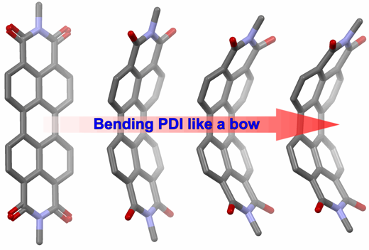 团队成员以苝二酰亚胺(PDI)为主体分子,选择不同长度/位阻的连接单元(Strings),通过一步四重Suzuki反应获得了四种不同弯曲程度的苝二酰亚胺弓形分子(PDI Bow)。光谱和电化学测试表明,与已报道的其它方式扭曲的PDI不同,弓形PDI随弯曲程度增加,其还原能力逐渐增强(LUMO降低)。结合DFT计算,该论文很好地解释了弓形弯曲对PDI的HOMO/LUMO能级的调控机制。这种弓形弯曲具有重要的科学意义,比如可以同时实现对PDI的单线态和三线态能级的调控,从而增强弓形PDI分子的单线态裂分,进而在太阳能电池应用中实现光电转化率的成倍增长,相关研究成果前期已在J. Am. Chem. Soc.,2019, 141, 13143−13147上发表。