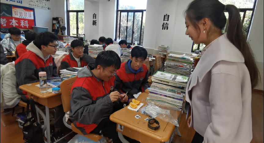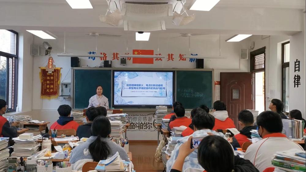 许鹭阳带来了《前辈精神续薪火,电池创新迎破晓——新型电化学储能器件的挑战与应用》一课,按照化学电源的分类——铜锌原电池、蓄电池、氢燃料电池等依次展开课程讲授。她带领同学们分组制作水果电池,还介绍了2022年北京冬奥会上精彩亮相的氢能源汽车,并以党的二十大报告中提到的“积极稳妥推进碳达峰碳中和”战略为展望,期望同学们关注地球母亲的健康,共同绘制美丽中国画卷。