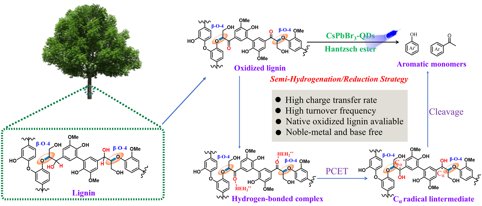 碳资源是地球上最丰富的有机资源,其高效利用对社会进步和经济发展至关重要,如煤点燃了第一次工业革命的熊熊烈火。然而,不可再生碳资源(煤、石油、天然气等)不仅储量有限,而且它们的开采,加工和利用过程加剧气候变化,对人类健康构成危害。因此,可再生碳资源绿色高效利用在减少碳排放和应对气候变化等方面具有重大意义,已成为全世界研究的热点。木质素是木质生物质的三大组分之一,是自然界中唯一的可提供再生性芳香基化合物的非化石类资源,约占地球碳资源总量的30%。化学催化解聚是木质素有效利用的一条重要途径,其中光催化在温和条件下实现木质素中碳-氧和碳-碳键选择性活化裂解,显示出巨大的应用潜力。