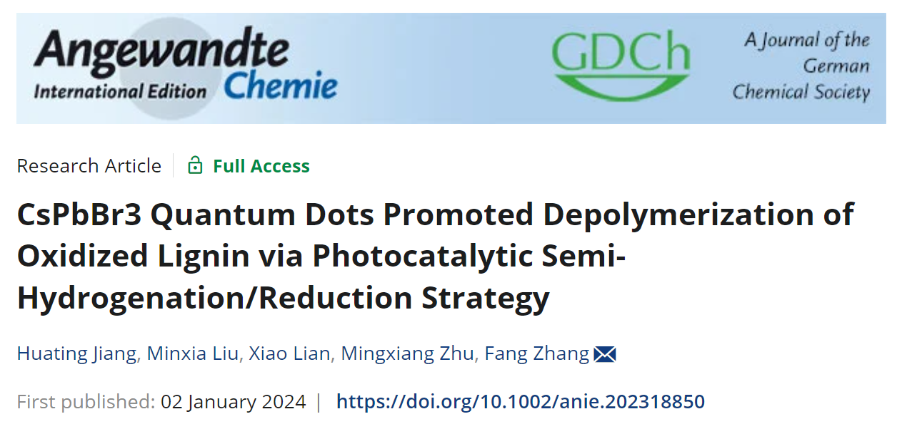 2024年1月,学院张昉团队在Angewandte Chemie International Edition在线发表题为“CsPbBr3 Quantum Dots Promoted Depolymerization of Oxidized Lignin via Photocatalytic Semi-Hydrogenation/Reduction Strategy”的研究文章。该研究首次利用钙钛矿量子点催化解聚木质素,为解决木质素由于自身特征(成分复杂、结构稳定和分子尺寸较大等)难以有效利用提供了一种新策略。
