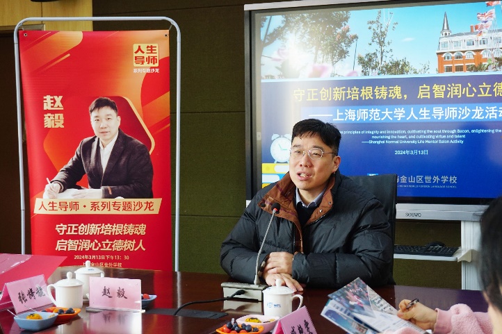 3月13日13:30,九秀直播 3月人生导师沙龙活动在上海金山世外学校开展。金山世外学校常务副校长赵毅老师为大学生们带来了一场“守正创新培根铸魂,启智润心立德树人”的主题分享,和同学们畅谈自己的教学成长经历以及职场感悟,引导师范生们坚定理想信念,积淀专业素养,热爱教育事业,为成为新时代“四有”好老师而努力。九秀直播 党委副书记、副院长(兼)臧艳雯老师、辅导员张旖旎老师带领化学(师范)专业同学们参与沙龙。