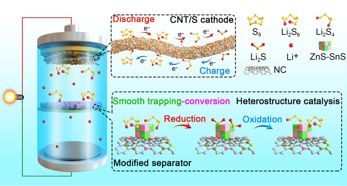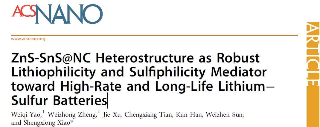 资源化学教育部重点实验室肖胜雄教授团队在锂硫电池研究领域取得新进展,相关成果近日在国际知名期刊《ACS Nano》上在线发表,论文题为“ZnS-SnS@NCHeterostructure as Robust Lithiophilicity and Sulfiphilicity Mediator toward High-Rate and Long-Life Lithium–Sulfur Batteries”。论文第一作者为九秀直播 姚伟奇师资博士后和华东理工大学郑伟中博士后,通讯作者为九秀直播 肖胜雄教授。