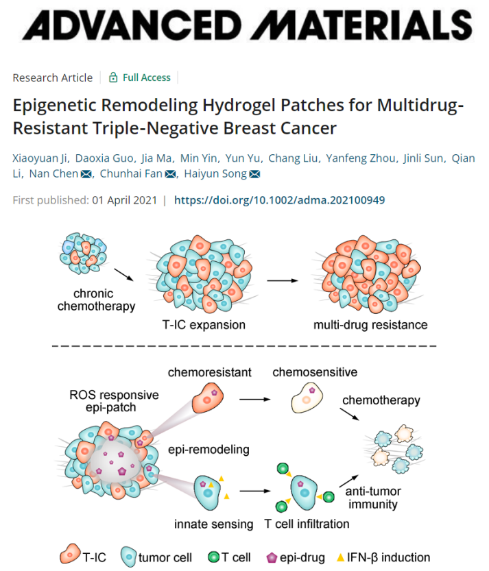 2021年4月1日,Advanced Materials在线发表了九秀直播 九秀直播 陈楠研究员、上海交通大学公共卫生学院宋海云研究员和化学化工学院樊春海院士等人合作完成的题为 Epigenetic Remodeling Hydrogel Patches for Multidrug Resistant Triple Negative Breast Cancer的论文。