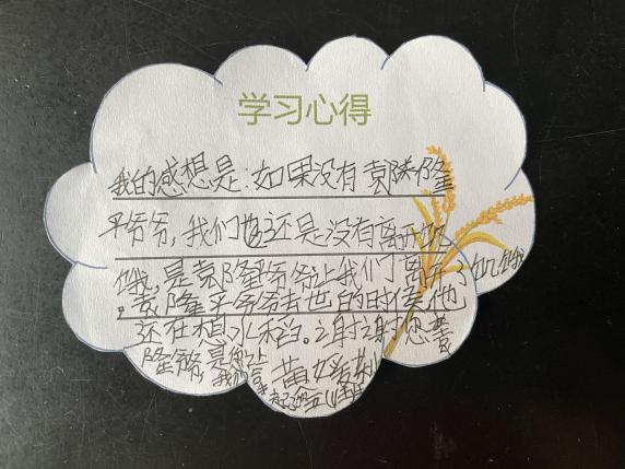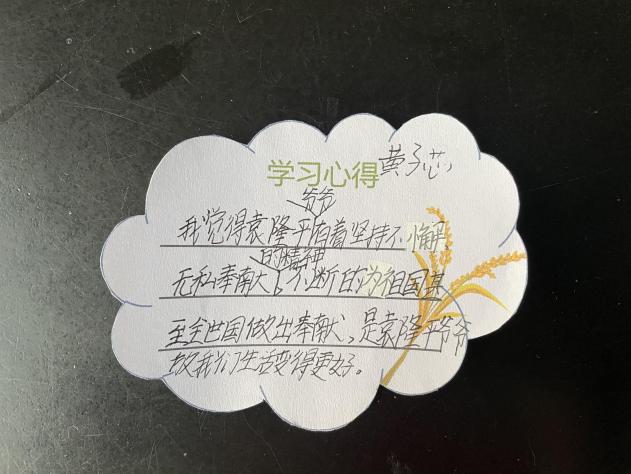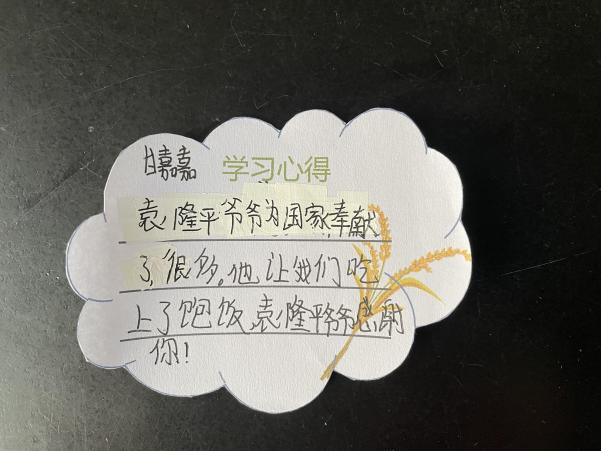 在动画演示与师生互动中,小朋友感动于袁隆平爷爷爱国爱民的赤子之心,钦佩于爷爷刻苦的奋斗精神。同学们学习了新知识“超级稻”,也更加明白了粮食的珍贵。课后,同学们纷纷写下了学习心得,表达对袁隆平爷爷的感激与缅怀之情。