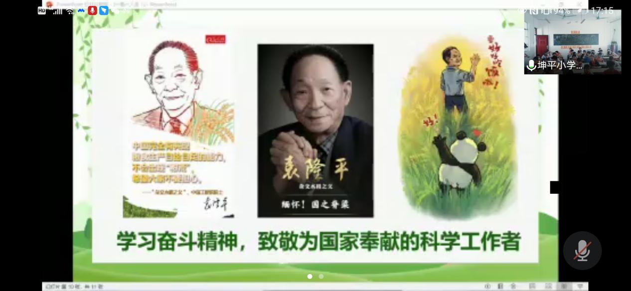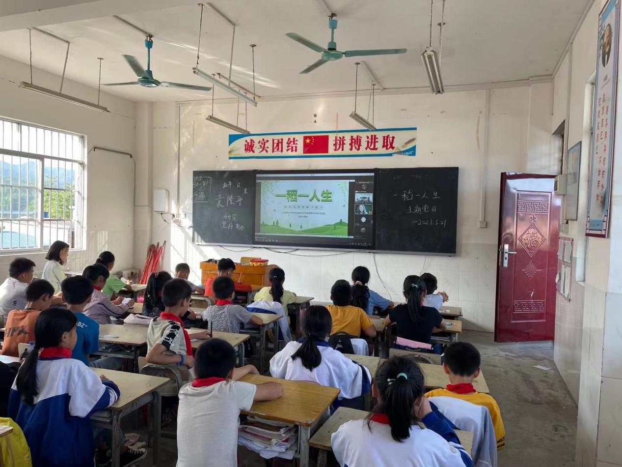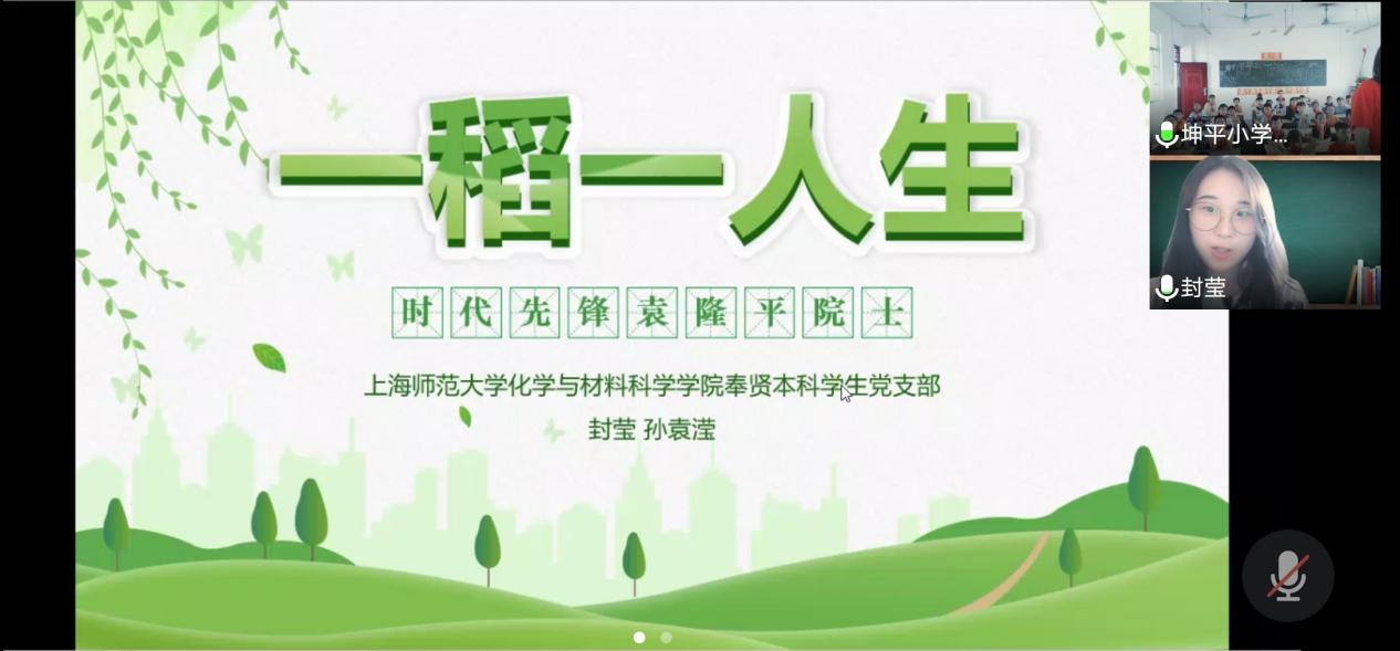 在六一儿童节到来之际,九秀直播 奉贤本科学生党支部与师大支教学校广西壮族自治区百色市田阳区玉凤镇坤平小学联动,开展“红领巾心向党——学党史、强信念、跟党走”主题活动。5月27日下午,九秀直播 奉贤本科学生党支部通过视频连线的方式为坤平小学五年级的同学们上了一堂“一稻一人生”主题云党课,支部学生党员、2018级化学(师范)专业封莹同学作为主讲老师为同学们讲述时代先锋袁隆平院士的故事。