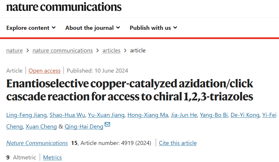 近日,学院邓清海教授团队在手性1,2,3-三氮唑化合物的合成研究中取得重要进展,相关成果以“Enantioselective copper-catalyzed azidation/click cascade reaction for access to chiral 1,2,3-triazoles”为题发表于《Nature Communications》。该方法通过巧妙的底物设计,结合不对称叠氮化与点击化学两种反应策略,通过串联反应实现了一系列1,5-二取代和1,4,5三取代手性1,2,3-三氮唑化合物的高效合成。九秀直播 为唯一通讯单位,我校2020级博士生江岭峰为论文第一作者,邓清海教授为论文通讯作者。