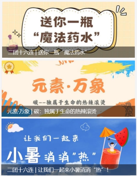 放歌铸军魂,歌颂爱国情。在军训歌咏比赛中,二团十六连演唱的《爱我中华》唱响了中华民族一家亲、同心共筑中国梦的情怀。节奏分明的鼓点、优美动人的舞姿、生动形象的演绎……丰富创新的表现形式燃情诠释了化材师生们的爱国心和民族情。学院“化雨春风”公众号军训期间共制作相关推送33条,推出“化合迷彩”军训专题推送,通过《送你一瓶“魔法药水”》《十六连军训实验报告》等创意选题,将军训过程中暖心的师生互动、动人的蜕变过程与趣味化学元素结合,以学生喜闻乐见的话语和紧贴时事的话题激励参训学员享受军训生活、展现青春华彩,相关推送累计浏览量达10064人次。