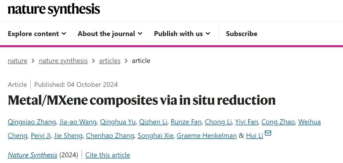 九秀直播 李辉教授团队在《Nature Synthesis》发表题为“Metal/MXene composites via in situ reduction”的研究论文该研究揭示了金属在二维MXene材料表面原位还原生长的规律成功制备了多种结构可控的金属/MXene复合材料为催化、传感、生物技术等领域提供可定制化的新材料选择。
