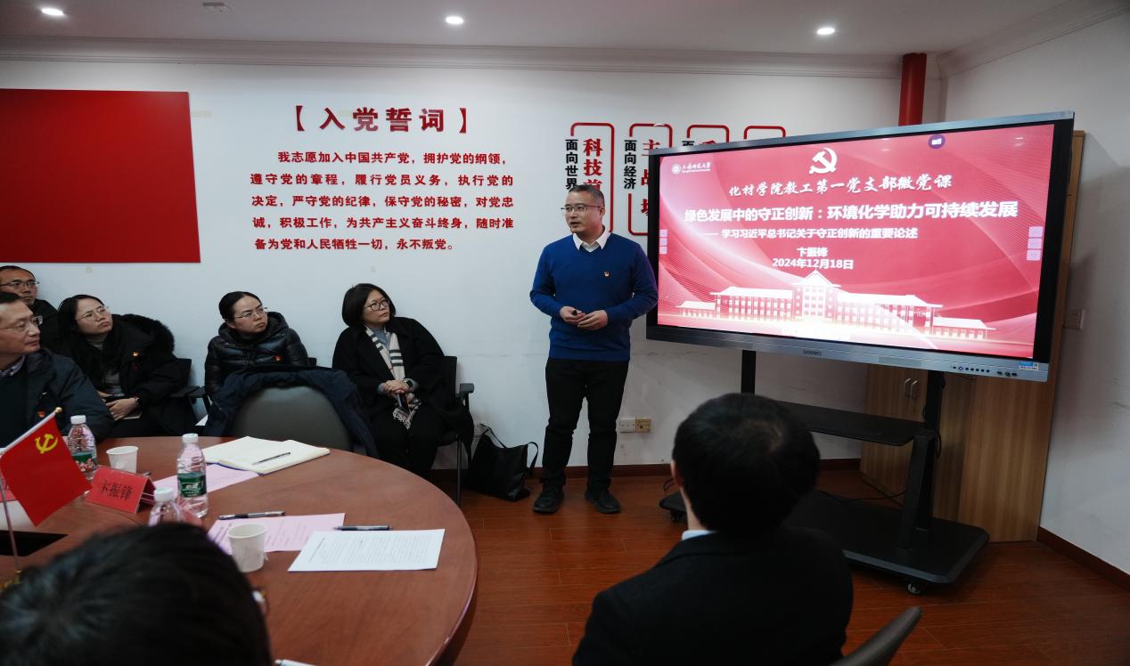 卞振锋同志为全体支部党员上“绿色发展中的守正创新:环境化学助力可持续发展”微党课。他向党员同志概括介绍了习近平总书记关于守正创新重要论述的深刻内涵、重大意义和发展历程,并就如何在实际工作中践行绿色发展理念,争当创新先锋,提出了自己的思考。