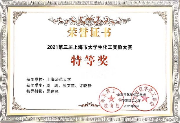 本科2018级高文静、周君潼、史婉怡分别获得第十五届上海大学生化学实验竞赛一等奖、二等奖和三等奖。