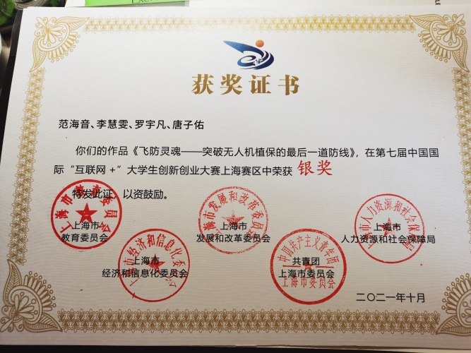 本科2019级徐睿、王汝歌、李思宇、梁心怡、何孟春、张锴文、贾浩田获得第七届中国国际“互联网+”大学生创新创业大赛上海赛区银奖、国赛铜奖。