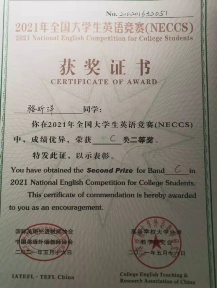 本科2018级骆昕洋获得2021年全国大学生英语竞赛(NECCS)C类国家级二等奖。