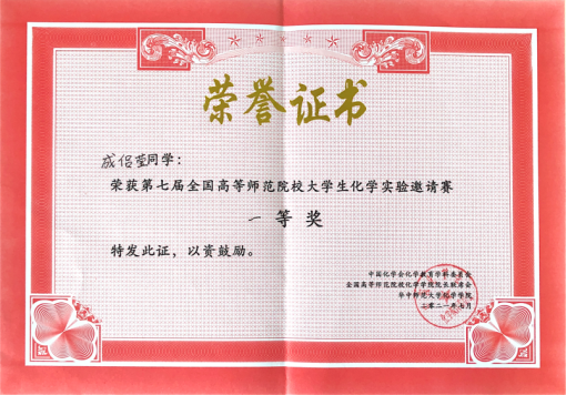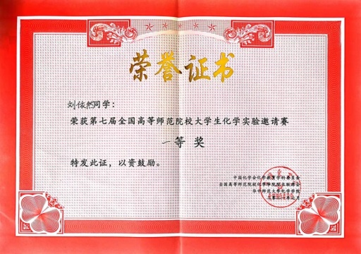 本科2018级刘依然获得全国高等师范院校大学生化学实验邀请赛国家级一等奖。