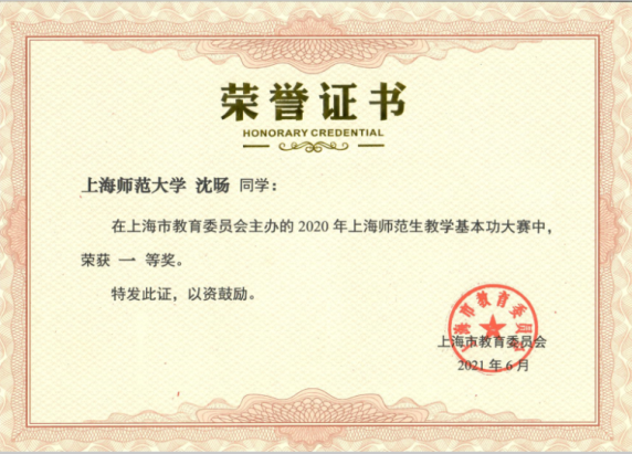 本科2018级沈旸获得2020年上海师范生教学基本功大赛一等奖。