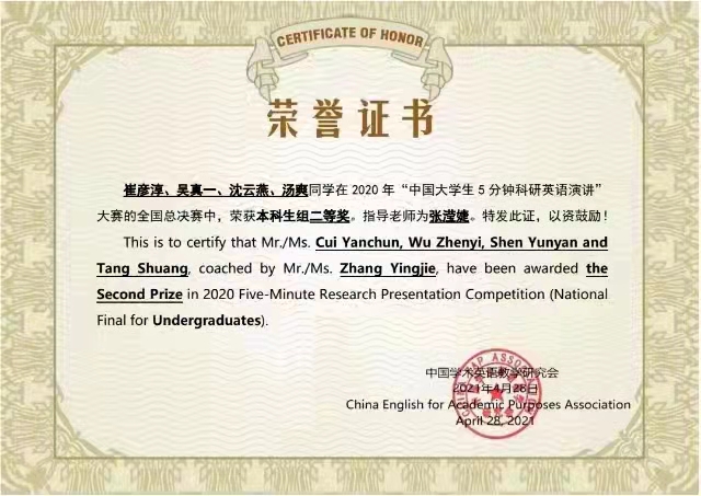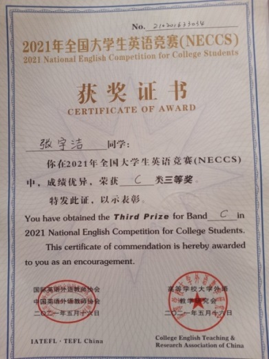 本科2019级张宇洁获得2021年全国大学生英语竞赛(NECCS)C类国家级三等奖。