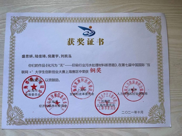 本科2018级应用化学专业范海音、李慧雯、罗宇凡、唐子佑获得第七届中国国际“互联网+”大学生创新创业大赛上海赛区银奖。
