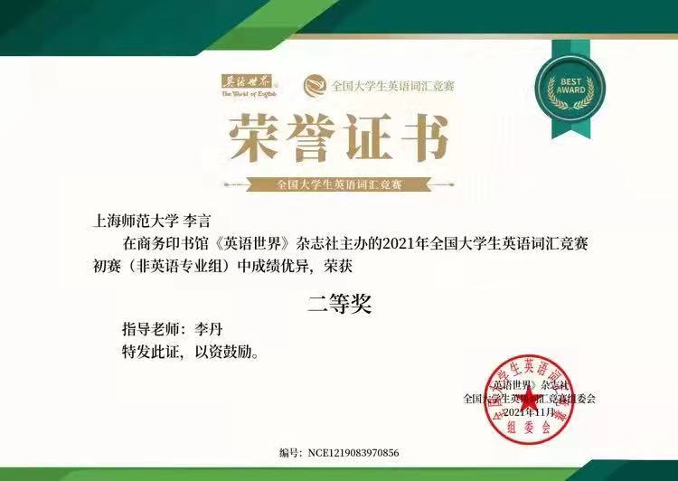 本科2020级李言获得2021年全国大学生词汇竞赛初赛(非英语专业组)二等奖。