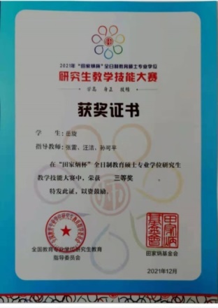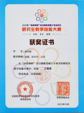 研究生杨开颜获得全日制教育硕士专业学位研究生教学技能大赛国家级三等奖。