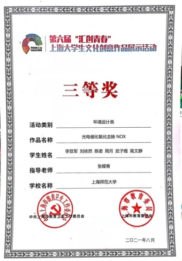 研究生徐佳慧、谢岩、周苏禹、叶琳琳、杨鸽获得第八届上海市大学生新材料创新创意大赛三等奖。