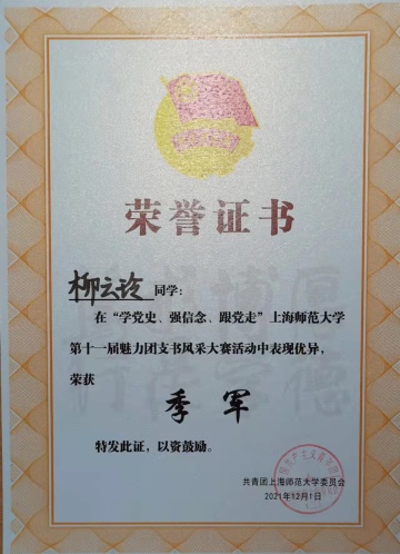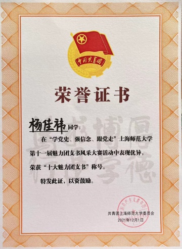 2021级学科课程论1班专硕团支部团支书杨佳祎获得第十一届魅力团支书风采大赛“十大魅力团支书”称号。