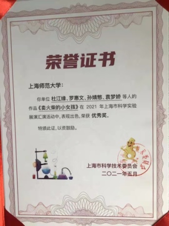 本科生杜江缘、罗惠文、孙婧慜、袁梦娇获得2021年上海市科学实验展演汇演优胜奖。