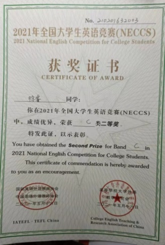 本科2019级徐睿获得2021年全国大学生英语竞赛(NECCS)C类国家级二等奖。
