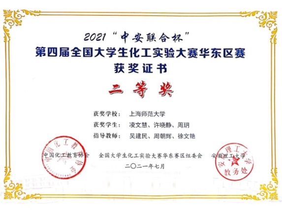 本科2018级周玥、凌文慧、许晓静获得2021“中安联合杯”第四届全国大学生化工实验大赛华东区赛二等奖。