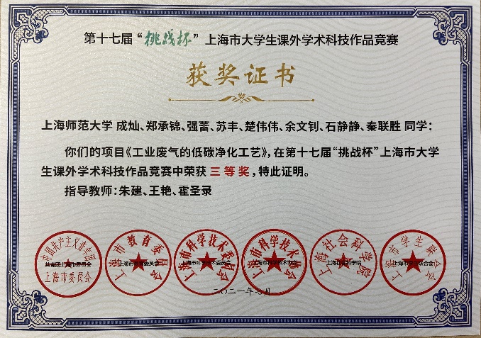 研究生成灿、郑承锦、强蕾、苏丰、楚伟伟、余文钊、石静静、秦联胜获得第十七届挑战杯上海市大学生课外学术科技作品竞赛三等奖。