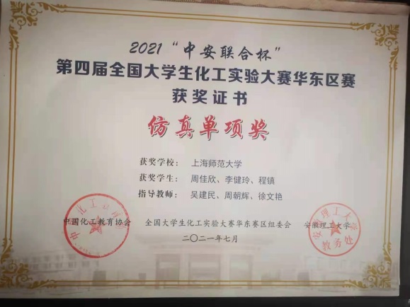 本科2018级李健玲、周佳欣、程镇获得2021“中安联合”杯第四届全国大学生化工实验大赛华东区赛仿真单项奖。