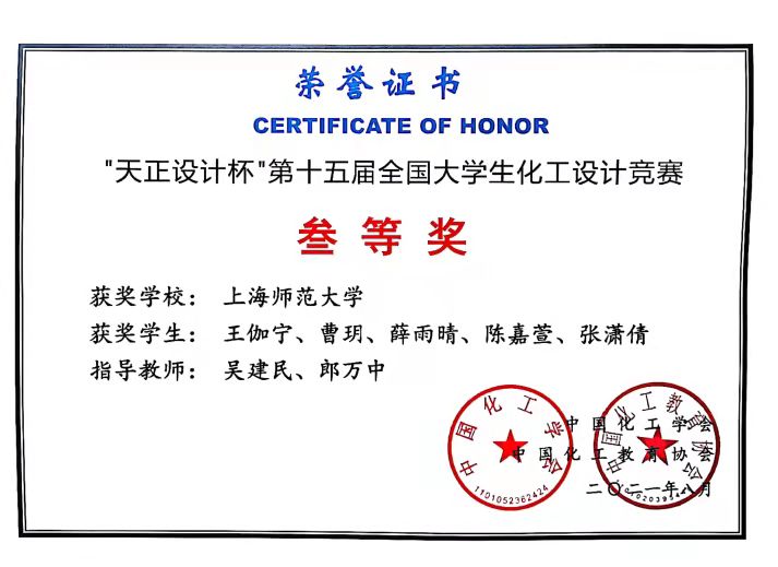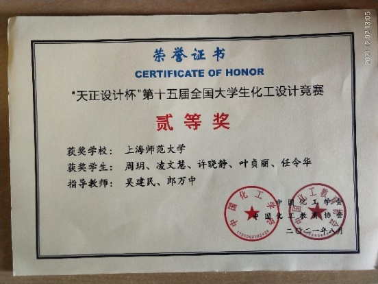 本科2018级化学工程与工艺周玥、凌文慧、许晓静、叶贞丽、任令华获得“天正设计杯”第十五届全国大学生化工设计竞赛国家级二等奖。