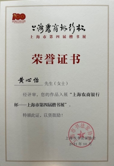 本科2018级黄心怡的书法作品在“上海农商银行杯——上海市第四届楷书展”中入展。