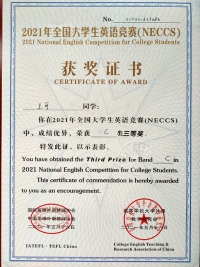 本科2020级王可获得2021年全国大学生英语竞赛(NECCS)C类国家级三等奖。