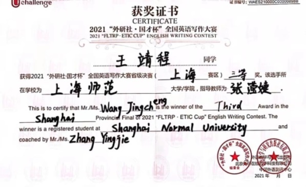 本科2021级王靖程获得“外研社·国才杯”全国英语写作大赛上海赛区三等奖。