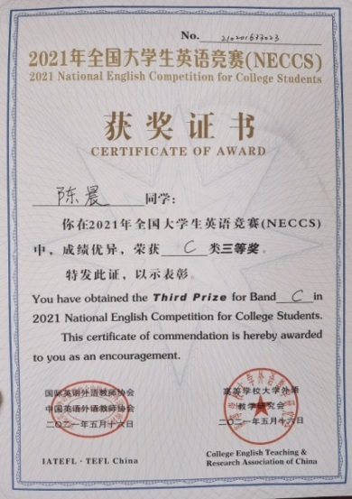本科2018级陈晨获得2021年全国大学生英语竞赛(NECCS)C类国家级三等奖。