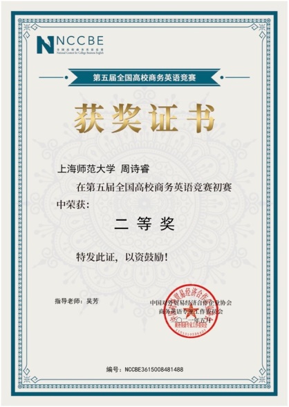 本科2020级周诗睿获得第五届全国高校商务英语竞赛初赛国家级二等奖。