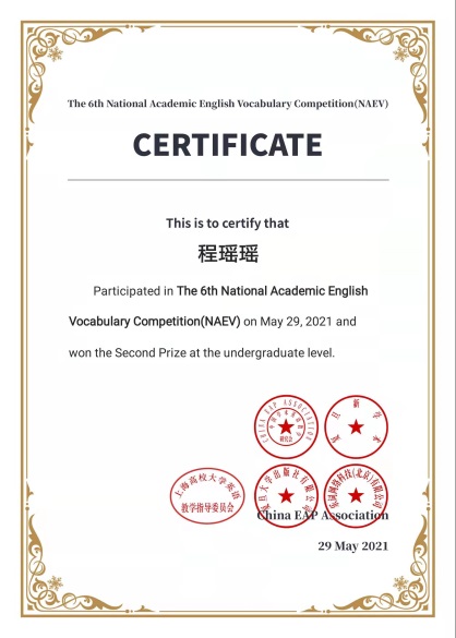 本科2019级程瑶瑶获得第六届学术英语词汇竞赛国家级二等奖。