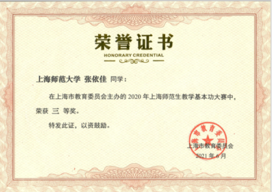本科2017级张依佳获得2020年上海师范生教学基本功大赛三等奖。
