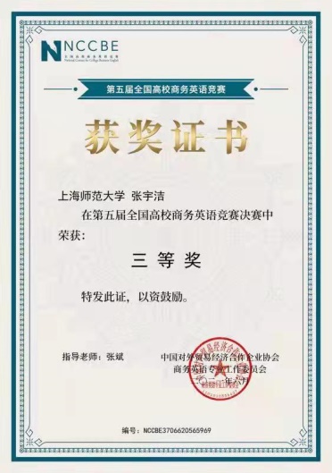 本科2019级张宇洁获得第五届全国高校商务英语竞赛决赛国家级三等奖。