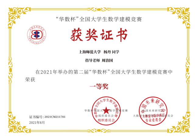 研究生杨丹获得第二届华数杯全国大学生数学建模竞赛国家级一等奖。