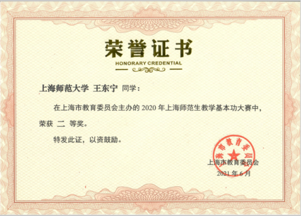 本科2017级王东宁获得2020年上海师范生教学基本功大赛二等奖。
