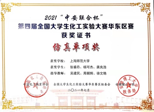 本科2018级龚良浩、张睿丹、杨可杰获得2021“中安联合杯”第四届全国大学生化工实验大赛华东区赛仿真单项奖。