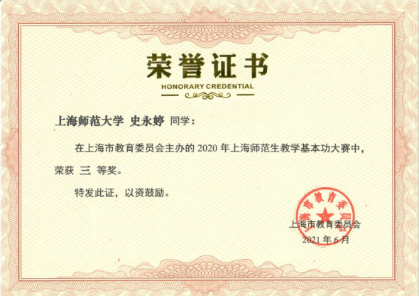 本科2018级史永婷获得2020年上海师范生教学基本功大赛三等奖。