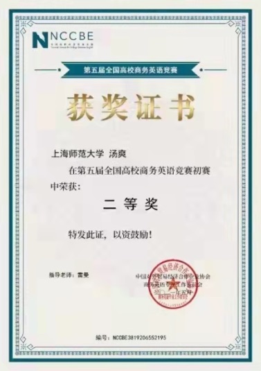 本科2019级汤爽获得第五届全国高校商务英语竞赛初赛国家级二等奖。