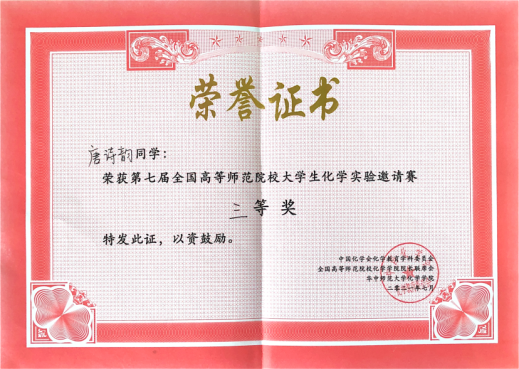 本科2018级唐诗韵获得全国高等师范院校大学生化学实验邀请赛国家级三等奖。