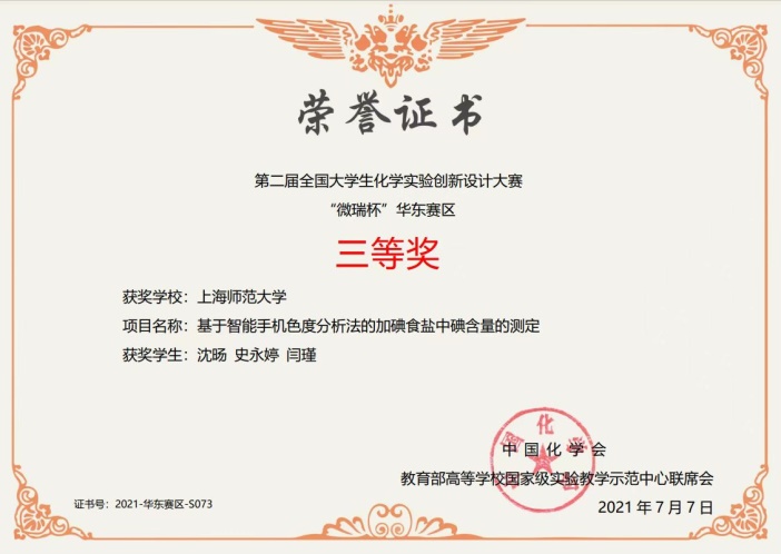 本科2018级沈旸、史永婷、闫瑾获得全国大学生化学实验创新设计大赛“微瑞杯”华东赛区三等奖。