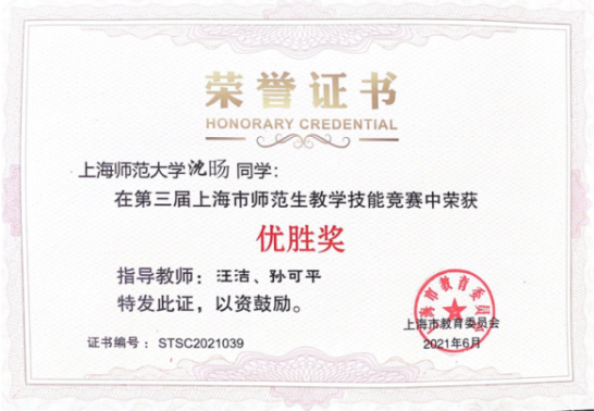 本科2018级沈旸获得第三届上海市师范生教学技能竞赛优胜奖。