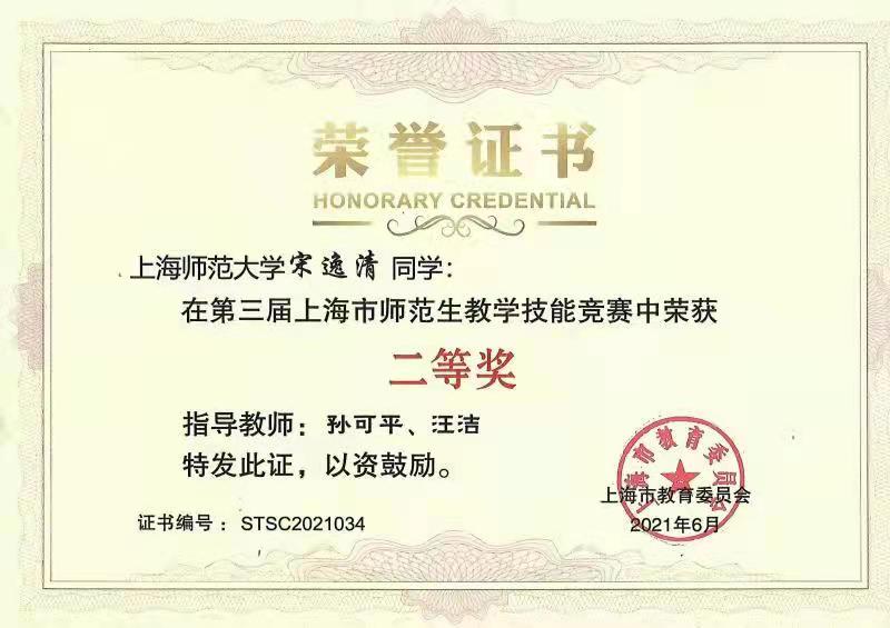 本科2018级宋逸清获得第三届上海市师范生教学技能竞赛二等奖。