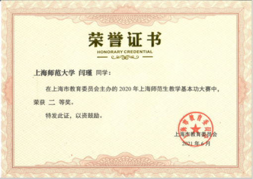 本科2018级闫瑾获得2020年上海师范生教学基本功大赛二等奖。