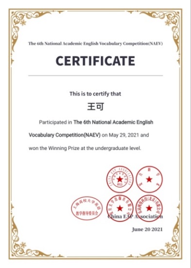 本科2020级王可获得第六届学术英语词汇竞赛国家级优胜奖。