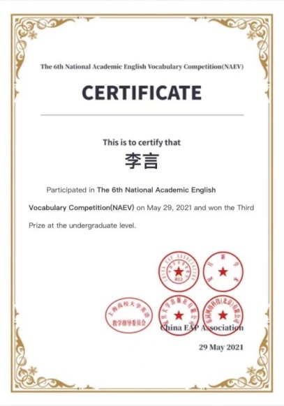 本科2020级李言获得第六届学术英语词汇竞赛国家级三等奖。